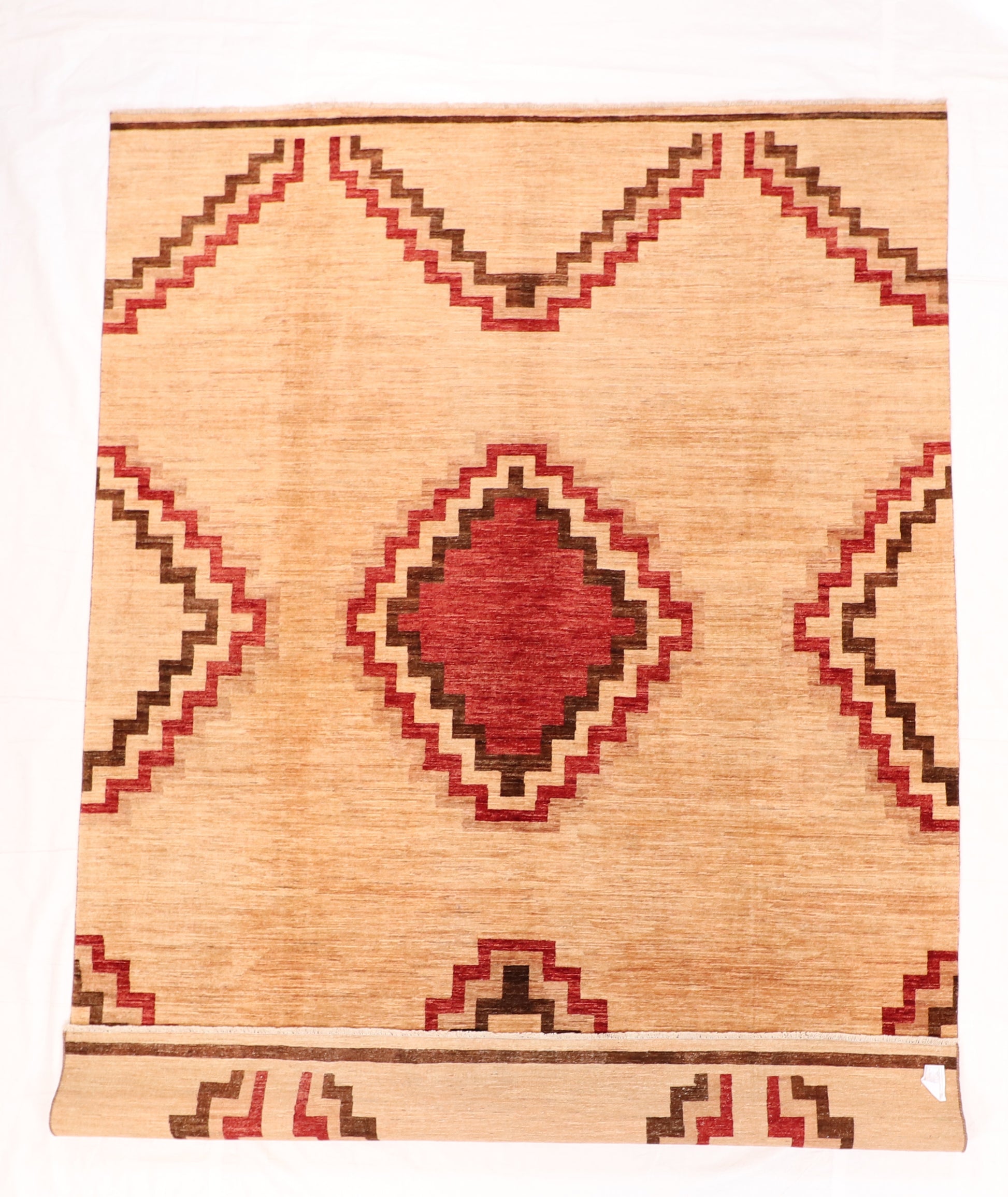This striking Mountain Modern rug showcases bold stepped geometrics arranged in a rhythmic, minimalist pattern. A rich red central medallion anchors the design, complemented by warm tan, espresso, and deep chestnut accents—creating a contemporary look grounded in tribal inspiration.